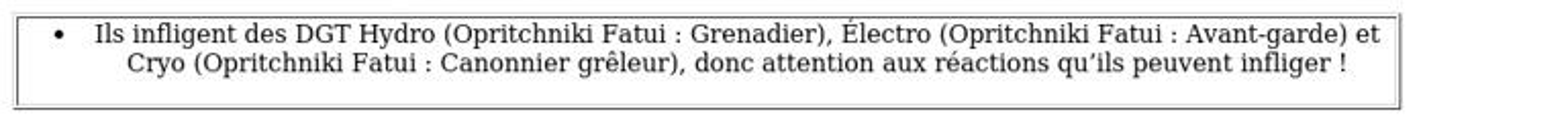 - L’Opritchniki Fatui, qu’il s’agisse de la troupier de ligne ou de la Gvardiya Foudroyante, ne possède aucune résistance spécifique, mais est également sensible à tous les éléments.