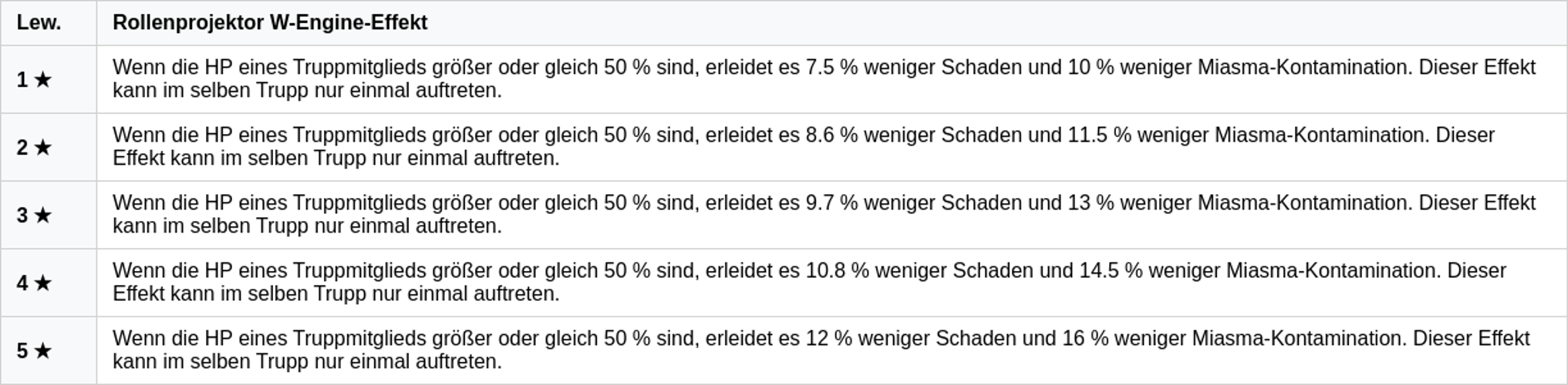 Die Fähigkeit des Reel-Projektors gewährt eine prozentuale Schadensminderung sowie eine Verringerung der Miasma-Kontamination, wodurch sowohl der erlittene Schaden als auch debuffartige Effekte reduziert werden.