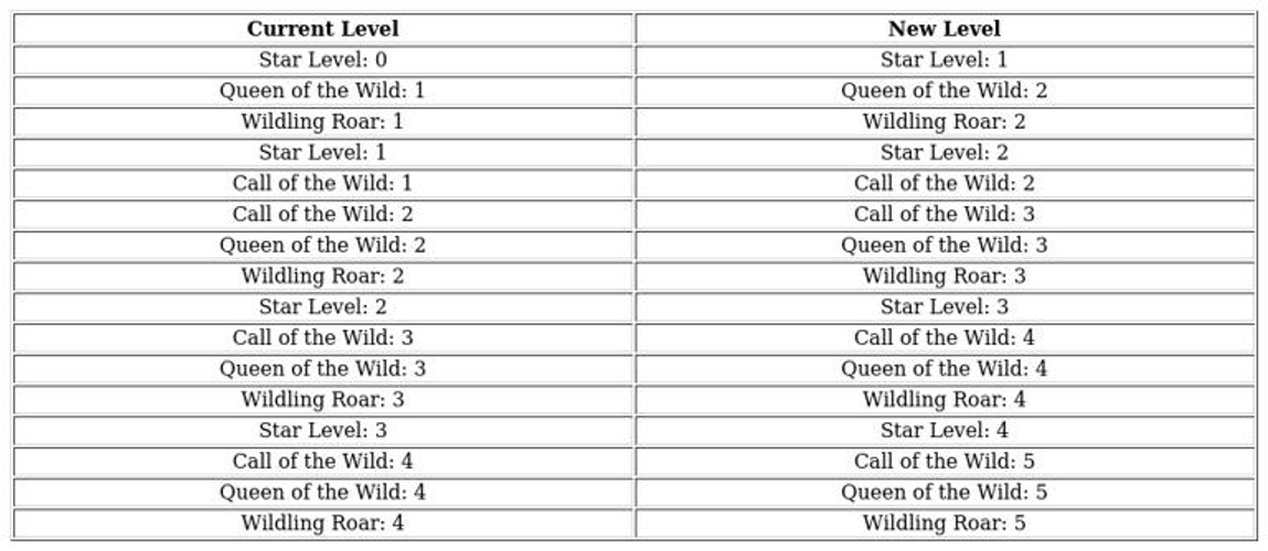 The initial column displays your hero’s existing skill level and star rank, while the adjacent column indicates the recommended upgrades.